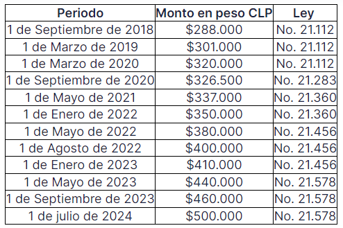 La siguiente tabla muestra la evolución del salario mínimo mensual desde 2018 hasta 2024, según la legislación aprobada: